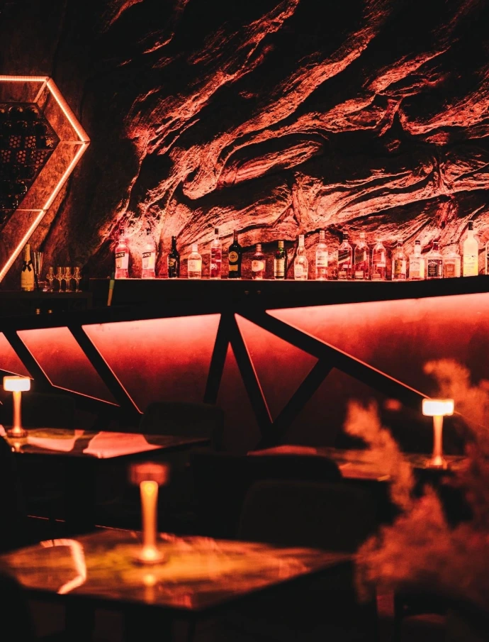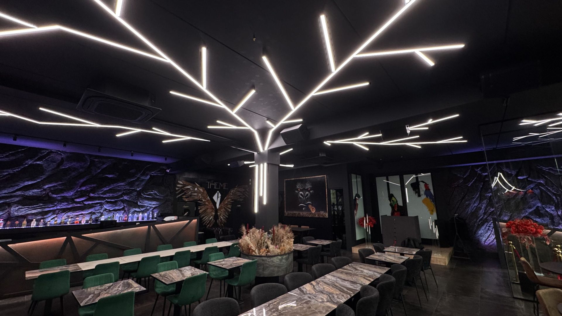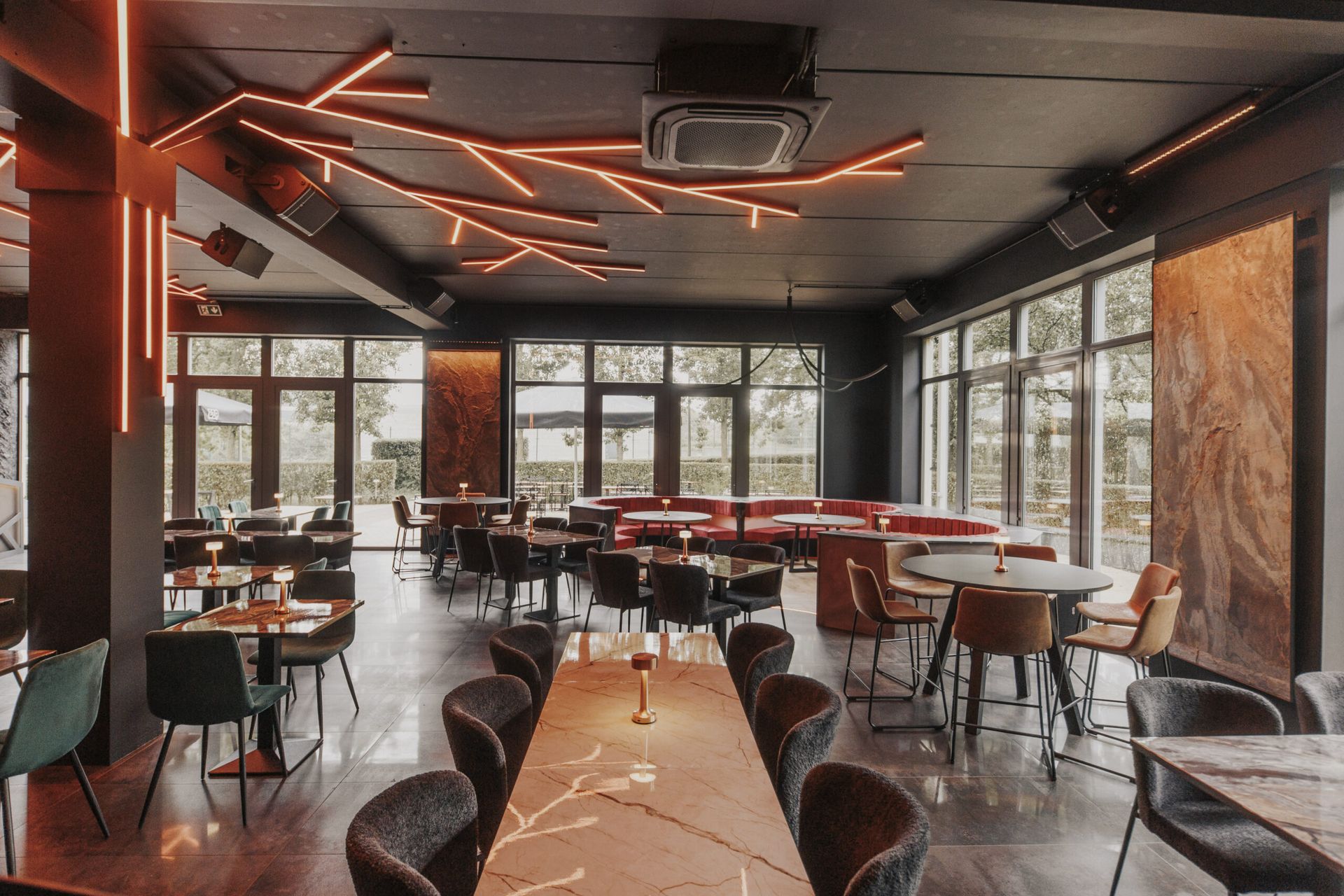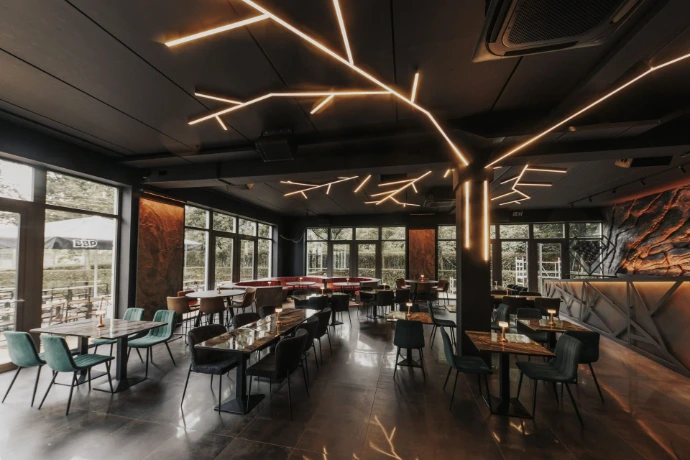 La mise en lumière sur mesure, avec des lignes LED architecturales intégrées au plafond en forme d'arbre, apporte une identité visuelle forte et évolutive, capable de transformer l’atmosphère du lieu selon les moments ou les événements.