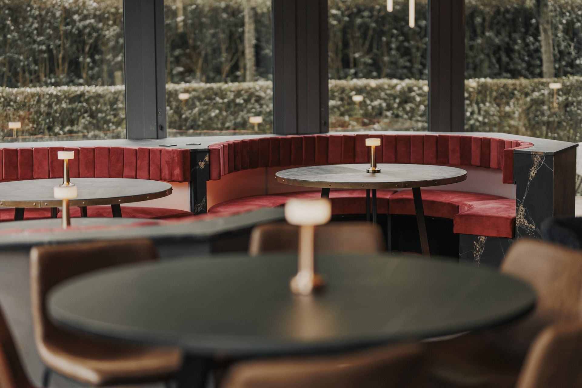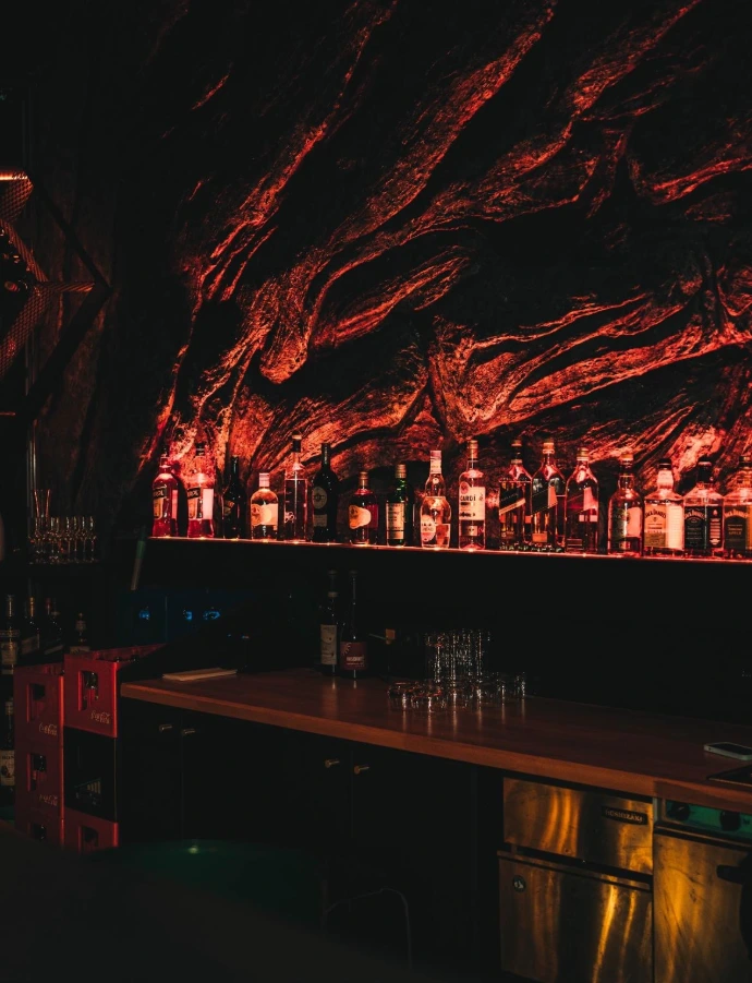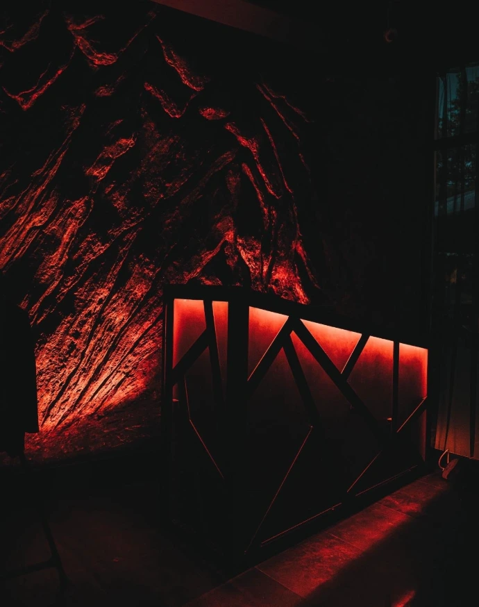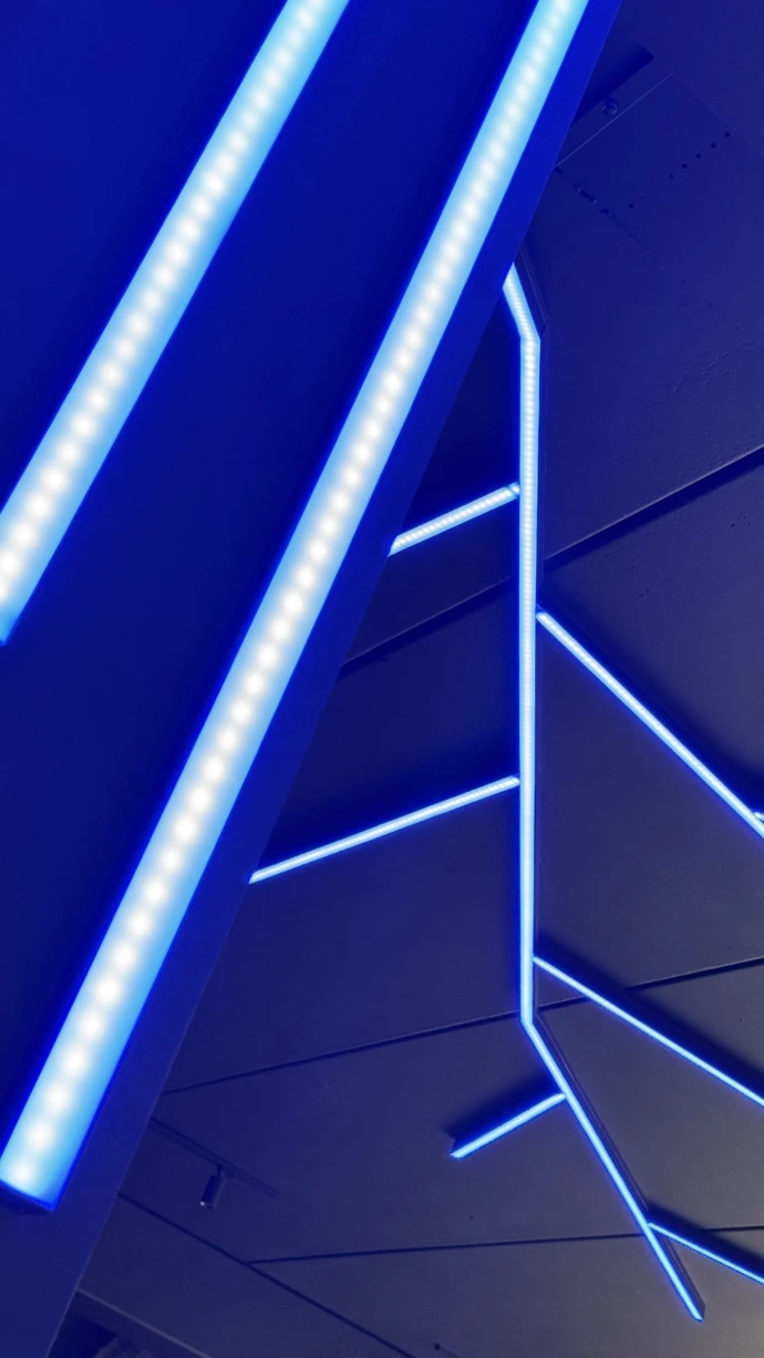 La mise en lumière sur mesure, avec des lignes LED architecturales intégrées au plafond en forme d'arbre, apporte une identité visuelle forte et évolutive, capable de transformer l’atmosphère du lieu selon les moments ou les événements.